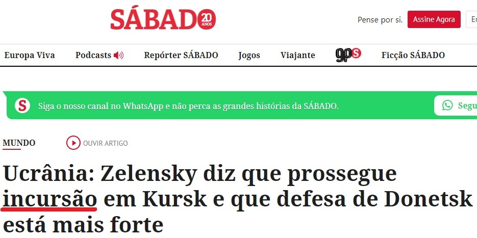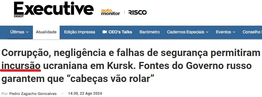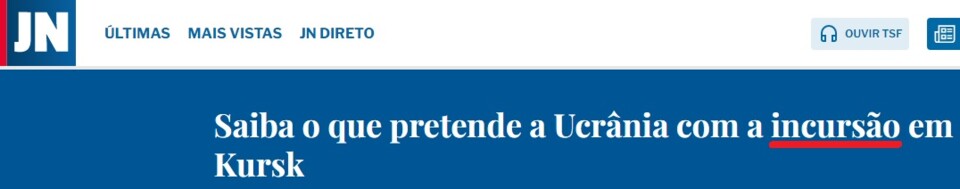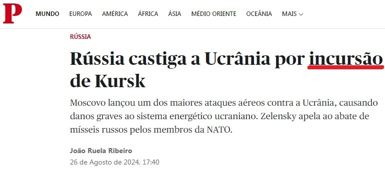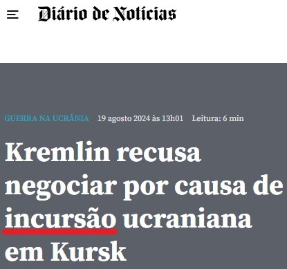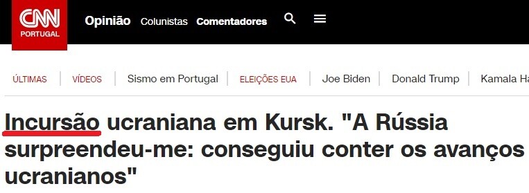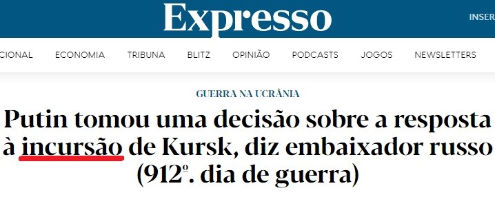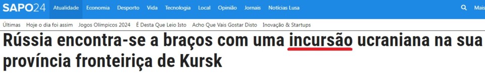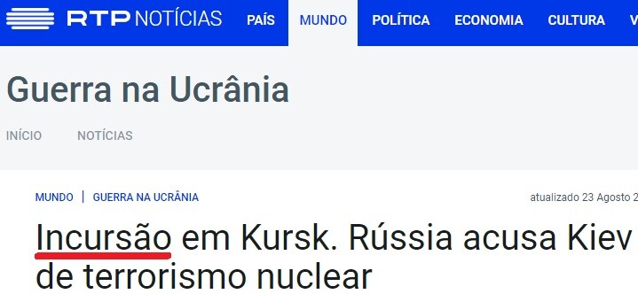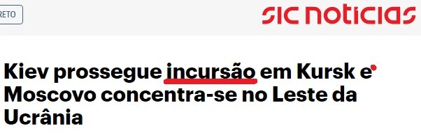 Entretanto verifica-se que TODOS os órgãos de comunicação social recorreram ao termo “incursão” para definir a parca (e porca) invasão ucraniana na Rússia. Nenhum quis ser original e tentou usar outro termo qualquer, por exemplo, ataque, investida, ou até mesmo um passeio ou excursão (porque não?). Todos, mas mesmo todos usaram, usam e abusam do termo “incursão”. Talvez seja pela simples razão de que, assim, não é possível dizer-se que há um “incursor” e um “incursido”. Deve ser por essa razão. Ou então, aqui que ninguém nos ouve (ou lê), o termo “incursão” ucraniana aparece todos os dias repetido na impoluta comunicação social, apenas porque esses FdP (Fanáticos da Propaganda) limitam-se a papaguear a cartilha de Washington. E como estão proibidos de a alterar, não se incomodam nada de fazer essa figurinha ridícula de escreverem as mesmas palavras, os mesmos parágrafos e até de fazerem, basicamente, as mesmas parangonas.
